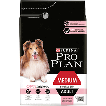 A complete dry food scientifically formulated for medium-sized adult dogs with sensitive skin.Sometimes dogs have sensitive skin and the signs include dandruff and scratching - sensitive skin may be caused by the food they eat.PRO PLAN DOG Medium Adult Sensitive Skin with OPTIDERMA is complete dog food for medium-sized adult dogs, tailored to the needs of a dog with sensitive skin.