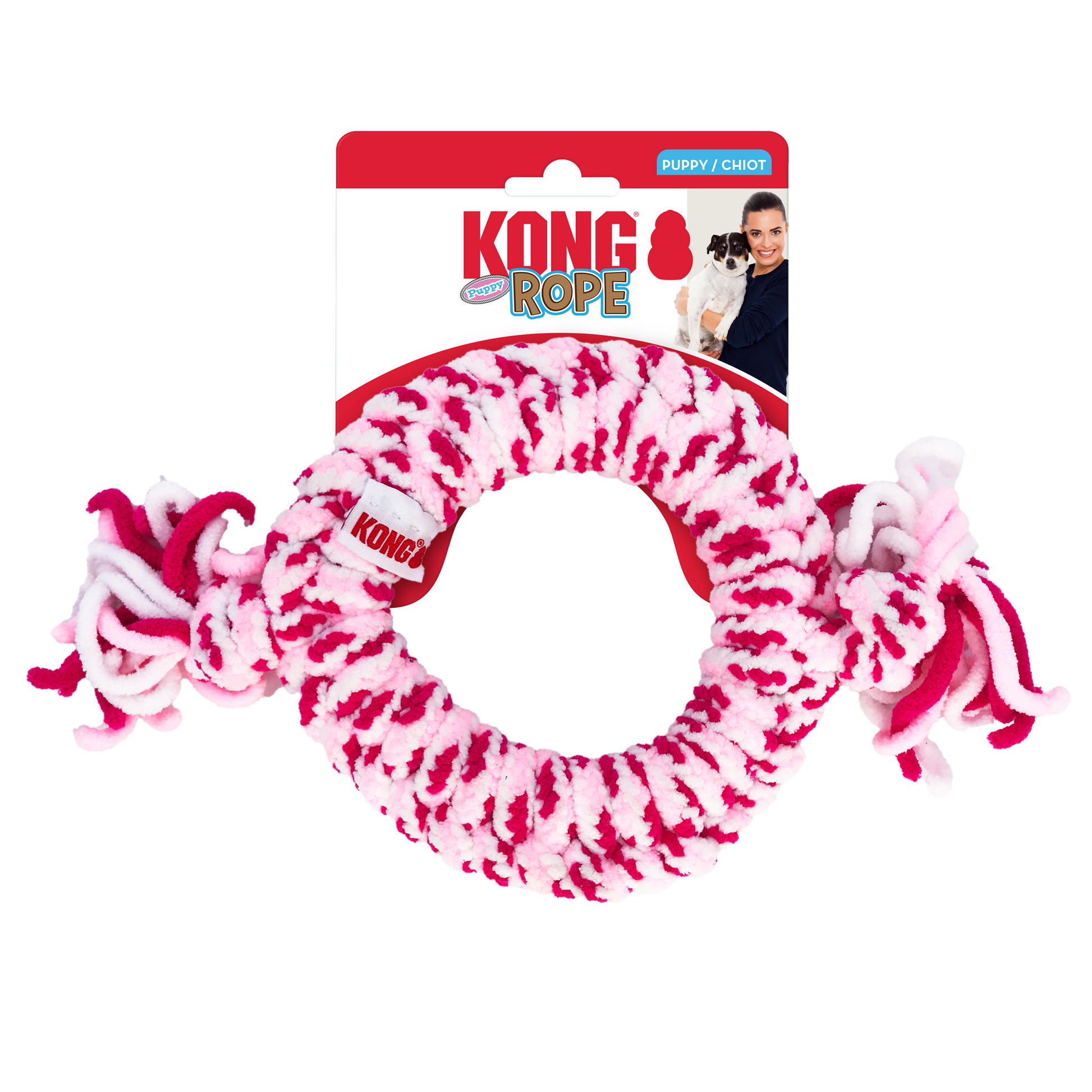 The KONG Rope Puppy Ring provides a satisfying chewing experience with a puppy-specific, ultra-soft, durable yarn material that is knitted into a rope shape. This robust construction is built for long-lasting play while supporting instinctual chewing needs. A dense, solid rope weave ensures long-lasting fun that reinforces appropriate chewing. Ideal for tugging fun.
